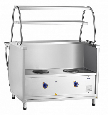-Конфорки оснащены регулировкой мощности, а двойная полка над мармитом 1-х блюд и оборудована лампой подсветки.