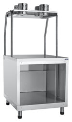 Для предупреждения скольжения по напольному покрытию предусмотрены резиновые вставки. Конструкция прилавка предусматривает обшивку сварного каркаса листовыми панелями. Все детали, включая столешницу и установленную на ней стойку с полкой, выполнены из нержавеющей стали. Для хранения столовых приборов установлено 4 перфорированных емкости. С внутренней стороны под рабочей поверхностью есть отсек, в котором можно хранить запас подносов, посуды.