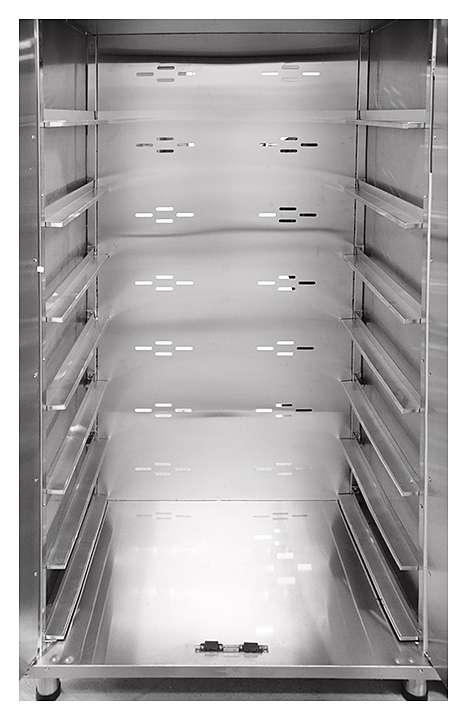 Двустворчатый, полностью разборный. Две распашные дверцы. Направляющие для лотков для хлеба ЛХБ-16 (456х740х71) без регулировки по высоте. Материал изготовления — нержавеющая сталь. Регулируемые по высоте ножки.