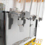 Предназначенные для напитков стеклянные ёмкости закрываются пластмассовыми крышками. Они, как и фигурные краники, привлекают дополнительное внимание к сокоохладителю.