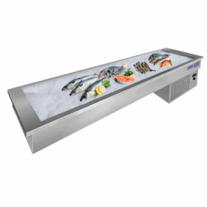Изделие выполнено под наклоном, что позволяет покупателю видеть содержимое емкости. Двойные стенки позволяют поддерживать определенную температуру в емкости и замедляют процесс таяния льда, а вмонтированный кран для слива воды позволяет подсоединить ванну напрямую к системе водоотведения. Охлаждение нижней стенки ванны происходит за счет встроенной холодильной системы, позволяющей сохранить как можно дольше лед, который неизбежно тает, контактируя с внешней средой. Все элементы витрины выполнены из нержавеющей стали. Поставляется в собранном виде.